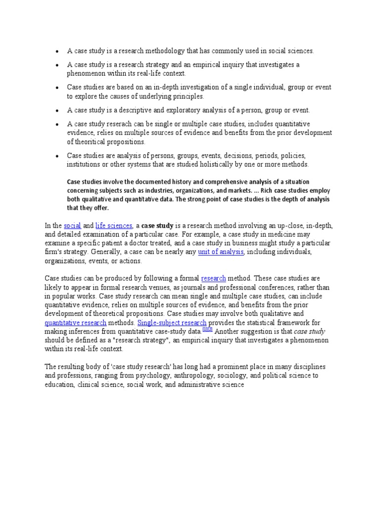 Examples & samples of case study. Such cases demonstrate how case research can be used to study things that researchers could not replicate in experimental settings. Amongst the sources of data the psychologist is likely to turn to when carrying out a case study are observations of a person's daily routine, unstructured interviews with the participant herself (and with people who know her), diaries, personal notes (e.g. Jun 23, 2019 · a case study is a research method that relies on a single case rather than a population or sample. The research may also continue for an extended period of time, so processes and developments can be studied as they happen.